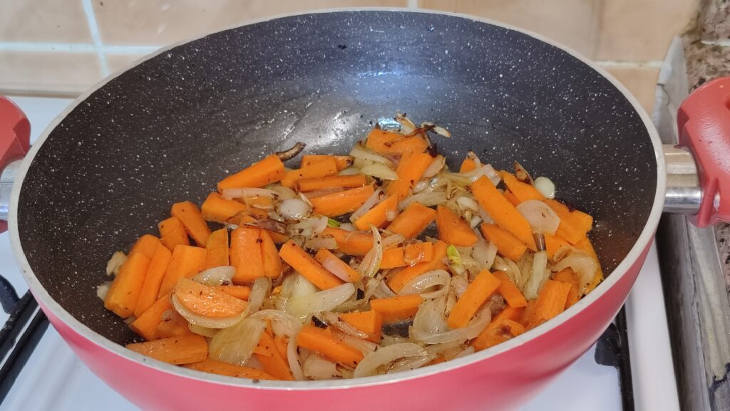 * Havuçları da ekleyip yaklaşık 7-8 dakika, havuçlar yumuşayana kadar pişirin.