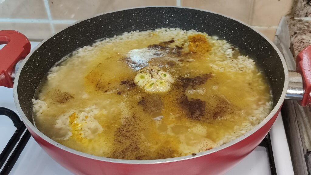 * 2 su bardağı pirinci yıkayıp süzün ve tencereye ekleyin. Tencerenin tam ortasına kabuğu soyulmamış bir baş sarımsağı yerleştirin.